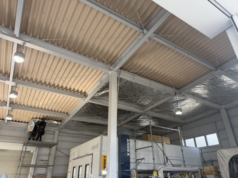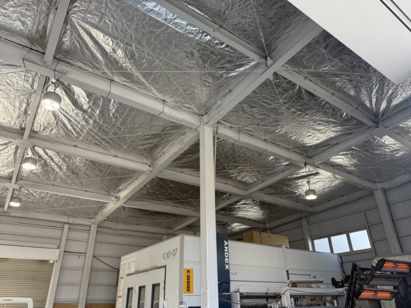 作業環境の改善のために工場の天井に遮熱シートを施工しました。